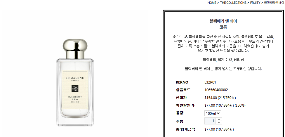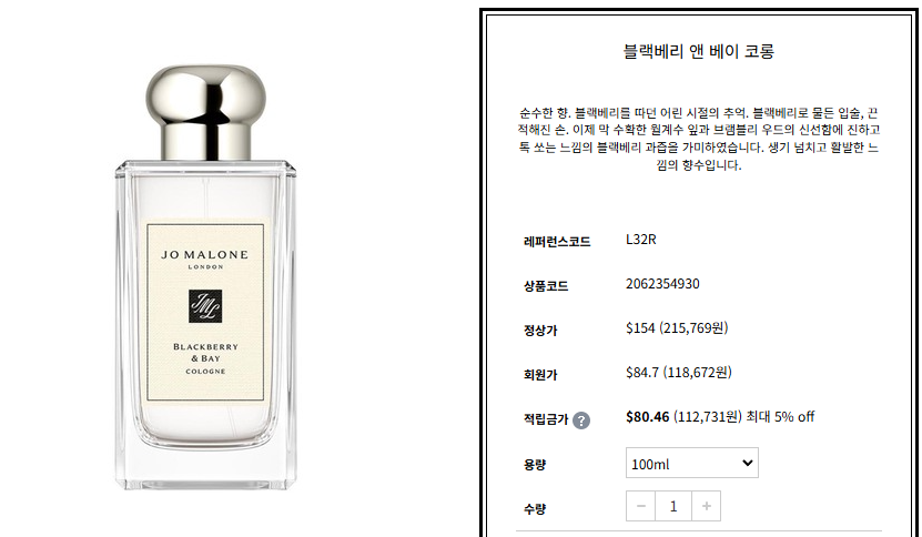 조말론 향수는 블랙베리 앤 베이 코롱이 가장 잘 팔리는 향입니다. 면세점별로 가격에 대해 확인해 보겠습니다. 먼저 백화점 정상 가격은 100ml 기준 약 23만 원 정도 합니다. 조말론 공식 몰에서는 약 22만 원에 + 바디 크림 15ml 증정으로 구매가 가능합니다.