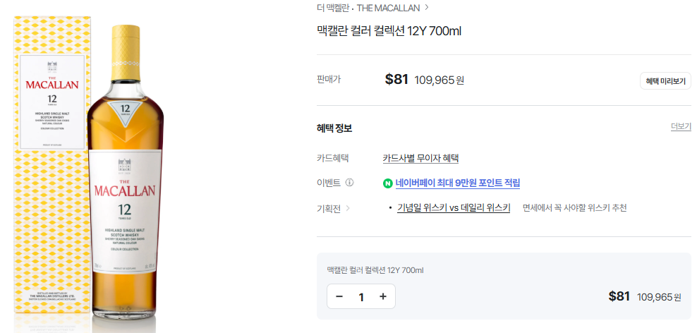 시리즈 특성: 컬러 컬렉션은 맥캘란이 자연적인 색상과 셰리 오크 숙성의 조화를 강조한 글로벌 리미티드 시리즈로, 특히 면세점 전용 제품으로 주목받고 있습니다.