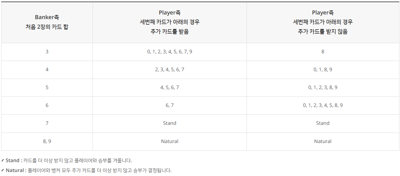 플레이어측 처음 2장의 카드 합이 5이하인 경우, 뱅커측 처음 2장의 카드 합이 2이하이면 양쪽 모두 추가카드 한 장을 받아야 하지만, 뱅커측 처음 2장의 카드 합이 3이상이면 다음의 Rule을 따릅니다.