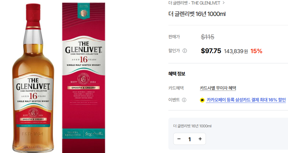글렌리벳 16년산은 화려함보다는 안정감과 완성도로 승부하는 싱글몰트 위스키입니다. 43도의 도수에서도 충분한 풍미와 질감을 보여주며, 특히 면세점 가격 기준으로는 용량과 숙성년수를 고려했을 때 매우 경쟁력 있는 선택지입니다. 위스키 입문자부터 데일리 고급 위스키를 찾는 사람까지 모두에게 추천할 수 있는 클래식한 한 병입니다.